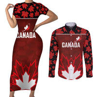 Custom Canadian Rugby Couples Matching Short Sleeve Bodycon Dress and Long Sleeve Button Shirt Maple Leaves Sporty Art Style Red Color