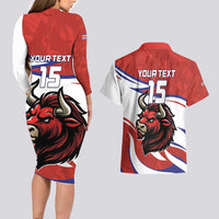 Custom Costa Rica Football Couples Matching Long Sleeve Bodycon Dress and Hawaiian Shirt Los Ticos With Bull Mascot LT15