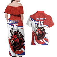 Custom Costa Rica Football Couples Matching Off Shoulder Maxi Dress and Hawaiian Shirt Los Ticos With Bull Mascot LT15
