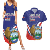 Custom Costa Rica Independence Day Couples Matching Summer Maxi Dress and Hawaiian Shirt Turdus Grayi Bird With Coat Of Arms