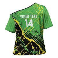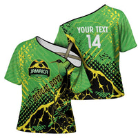 Turn heads and express your unique style with the Custom Jamaica Football Cross Shoulder Shirt Come On Reggae Boyz Red-billed streamertail from Wonder Print Shop. Perfect for casual outings, festivals, or making a fashion statement, this custom-made cross shoulder shirt combines high-end craftsmanship with eye-catching design.