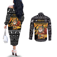 Egypt Christmas Couples Matching Off The Shoulder Long Sleeve Dress and Long Sleeve Button Shirt with Pharaoh Santa Pyramids Eye of Horus and Ancient Egyptian TS04