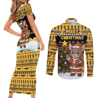 Egypt Christmas Couples Matching Short Sleeve Bodycon Dress and Long Sleeve Button Shirt with Santa Cat Sleigh Reindeer Christmas Tree and Ancient Hieroglyphic TS04