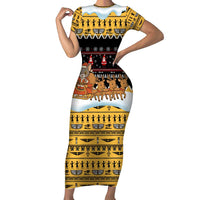 Egypt Christmas Short Sleeve Bodycon Dress with Santa Cat Sleigh Reindeer Christmas Tree and Ancient Hieroglyphic