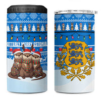 Estonia Christmas 4 in 1 Can Cooler Tumbler with Santa Otters Lights Snowflakes and National Emblem on Blue Pattern TS04
