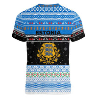 Estonia Christmas Women V-Neck T-Shirt with Reindeer Gingerbread Snowflakes National Emblem and Winter Forest TS04
