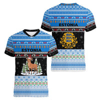 Estonia Christmas Women V-Neck T-Shirt with Reindeer Gingerbread Snowflakes National Emblem and Winter Forest