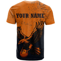 Flying Eagle Carrying Bowling Ball T Shirt with Grunge Orange and Black Splatter Design