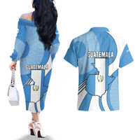 Guatemala Flag Map Couples Matching Off The Shoulder Long Sleeve Dress and Hawaiian Shirt with Blue White Swirl and Geometric Pattern Design