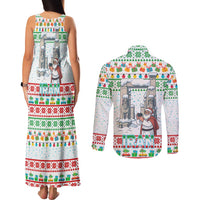 Iran Christmas Couples Matching Tank Maxi Dress and Long Sleeve Button Shirt with Santa Taking Photos Ancient Columns and Snowflake Gift Pattern TS04