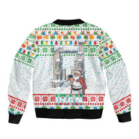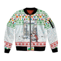 Iran Christmas Sleeve Zip Bomber Jacket with Santa Taking Photos Ancient Columns and Snowflake Gift Pattern
