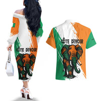 Ivory Coast Couples Matching Off The Shoulder Long Sleeve Dress and Hawaiian Shirt with Tribal Elephant and Paint Splash Design