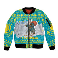 Kazakhstan Christmas Sleeve Zip Bomber Jacket with Santa Skiing in Traditional Outfit Snow Mountain and Sun Pattern