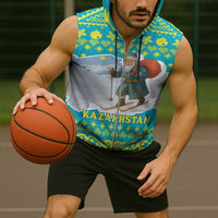 Kazakhstan Christmas Sleeveless Zip Hoodie with Santa Skiing in Traditional Outfit Snow Mountain and Sun Pattern TS04