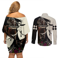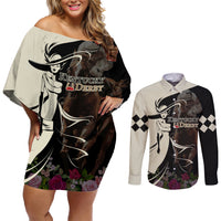 Kentucky Racing Horses Derby Hat Girl Couples Matching Off Shoulder Short Dress and Long Sleeve Button Shirt Black Color