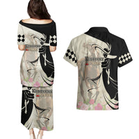 Kentucky Racing Horses Derby Hat Girl Couples Matching Puletasi and Hawaiian Shirt Beige Color