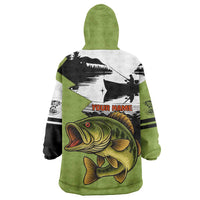 Largemouth Bass Fishing Wearable Blanket Hoodie Fish On Text and Boat Scene in Green and Black Custom Design TS04