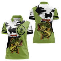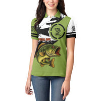 Largemouth Bass Fishing Women Polo Shirt Fish On Text and Boat Scene in Green and Black Custom Design