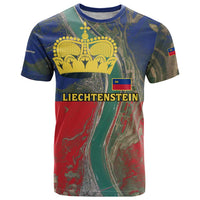 Liechtenstein T Shirt with Red Blue Aerial River Design and Yellow Crown Emblem