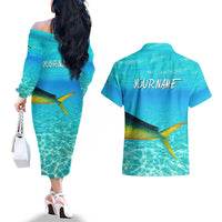 Mahi Mahi Fishing Customize Name Couples Matching Off The Shoulder Long Sleeve Dress and Hawaiian Shirt Underwater Blue Background in Tropical Ocean Scene TS04