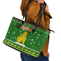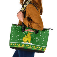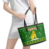 Myanmar Christmas Leather Tote Bag with Green-Gold Theme, Chinthe Lion, and Santa Motif