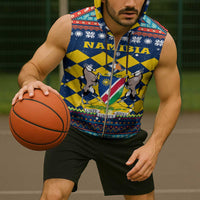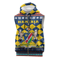 Order your Namibia Christmas Sleeveless Zip Hoodie with Blue-Yellow Diamond Pattern, Coat of Arms, and Flag Map Motif by Wonder Print Shop today and discover the perfect mix of movement, comfort, and street-ready style.