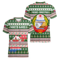 North Korea Christmas Women V-Neck T-Shirt with Green-Red Design, National Emblem, and Festive Snowflake Motif TS04