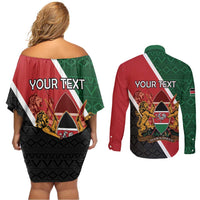 Personalised Kenya Couples Matching Off Shoulder Short Dress and Long Sleeve Button Shirt Coat Of Arms Mix Flag Style