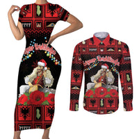 Personalized Albania Christmas Couples Matching Short Sleeve Bodycon Dress and Long Sleeve Button Shirt Albanian Man Playing Lahuta With Red Poppy