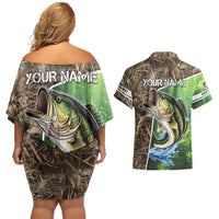 Personalized Bass Fishing Design Couples Matching Off Shoulder Short Dress and Hawaiian Shirt Leaping Fish Graphic and Camouflage Green Water Splash Print