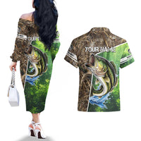 Personalized Bass Fishing Design Couples Matching Off The Shoulder Long Sleeve Dress and Hawaiian Shirt Leaping Fish Graphic and Camouflage Green Water Splash Print TS04