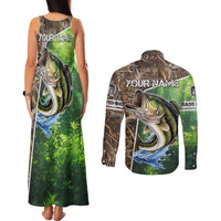 Personalized Bass Fishing Design Couples Matching Tank Maxi Dress and Long Sleeve Button Shirt Leaping Fish Graphic and Camouflage Green Water Splash Print TS04
