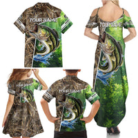 Personalized Bass Fishing Design Family Matching Summer Maxi Dress and Hawaiian Shirt Leaping Fish Graphic and Camouflage Green Water Splash Print