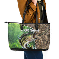 Personalized Bass Fishing Design Leather Tote Bag Leaping Fish Graphic and Camouflage Green Water Splash Print