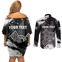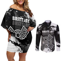 Personalized Brittany Celtic Cross Couples Matching Off Shoulder Short Dress and Long Sleeve Button Shirt With Celtic Knotwork