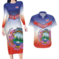 Personalized Costa Rica Independence Day Couples Matching Long Sleeve Bodycon Dress and Hawaiian Shirt Coat Of Arms With Purple Guaria Morada Orchid