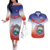 Personalized Costa Rica Independence Day Couples Matching Off The Shoulder Long Sleeve Dress and Hawaiian Shirt Coat Of Arms With Purple Guaria Morada Orchid