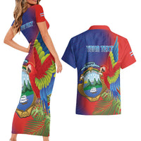 Personalized Costa Rica Independence Day Couples Matching Short Sleeve Bodycon Dress and Hawaiian Shirt Scarlet Macaw Parrot With Coat Of Arms