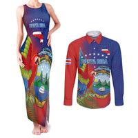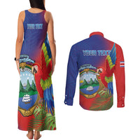 Personalized Costa Rica Independence Day Couples Matching Tank Maxi Dress and Long Sleeve Button Shirt Scarlet Macaw Parrot With Coat Of Arms