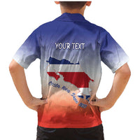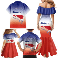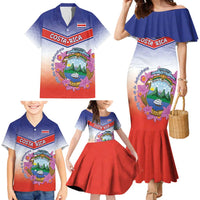 Personalized Costa Rica Independence Day Family Matching Mermaid Dress and Hawaiian Shirt Coat Of Arms With Purple Guaria Morada Orchid