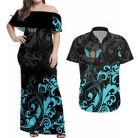 Personalized Elegant Wings and Dartboard Design Couples Matching Off Shoulder Maxi Dress and Hawaiian Shirt with Swirling Floral Patterns
