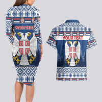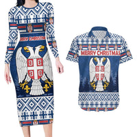 Personalized Serbia Christmas Couples Matching Long Sleeve Bodycon Dress and Hawaiian Shirt Coat Of Arms - Blue Version