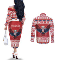 Personalized Serbia Christmas Couples Matching Off The Shoulder Long Sleeve Dress and Long Sleeve Button Shirt Double-Headed Eagle - Red Version