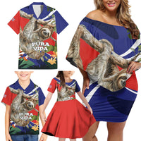 Pura Vida Costa Rica Sloth Family Matching Off Shoulder Short Dress and Hawaiian Shirt Tropical Flowers Flag Color LT15