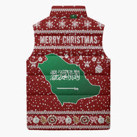 Get your Saudi Arabia Christmas Sleeveless Puffer Jacket with Red Festive Pattern, National Emblem with Palm and Swords, and Map Motif by Wonder Print Shop today and experience warmth, style, and versatility in one perfect piece.