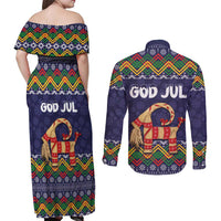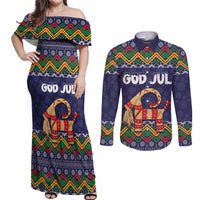 Scandinavian Yule Goat Christmas Couples Matching Off Shoulder Maxi Dress and Long Sleeve Button Shirt with Scandinavian Folk Pattern Style