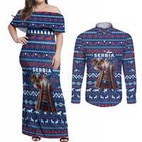Serbia Christmas Couples Matching Off Shoulder Maxi Dress and Long Sleeve Button Shirt with Traditional Santa Eagle Serbian Coat of Arms and Blue Red White Folk Pattern Design