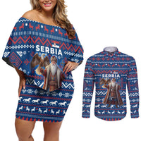 Serbia Christmas Couples Matching Off Shoulder Short Dress and Long Sleeve Button Shirt with Traditional Santa Eagle Serbian Coat of Arms and Blue Red White Folk Pattern Design