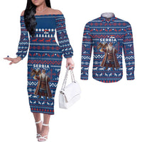 Serbia Christmas Couples Matching Off The Shoulder Long Sleeve Dress and Long Sleeve Button Shirt with Traditional Santa Eagle Serbian Coat of Arms and Blue Red White Folk Pattern Design