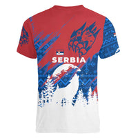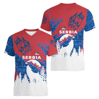 Serbia Christmas Women V-Neck T-Shirt with Wolf Howling Moon Serbian Flag and Red Blue White Winter Forest Pattern Design TS04